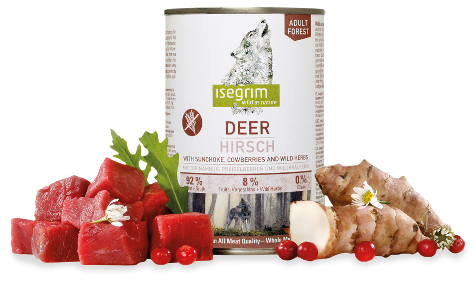Ingrediente: Carne și derivate de origine animală (33% căprioară, 30% carne de pasăre), supă (29%), derivate de origine vegetală (3,8% topinambur), fructe (3% afine), minerale (1%), plante medicinale (0,1%), uleiuri și grăsimi (0,1% ulei de somon).