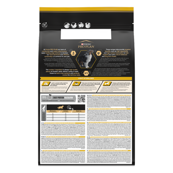 Purina Pro Plan All Sizes Adult Light/Sterilised cu OPTIWEIGHT® este o hrană uscată completă pentru câinii adulți supraponderali sau sterilizați de toate taliile. Este realizată cu nutrienți specifici și cu fibre la niveluri care satisfac foamea câinelui, deși este săracă în grăsimi și în calorii. Conținutul nutrițional al acestei hrane uscate pentru câini îi permite proprietarului să gestioneze apetitul și foamea câinelui său, în timp ce îi menține masa musculară și îl ajută la susținerea articulațiilor sănătoase.