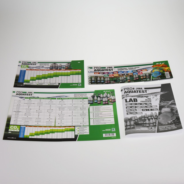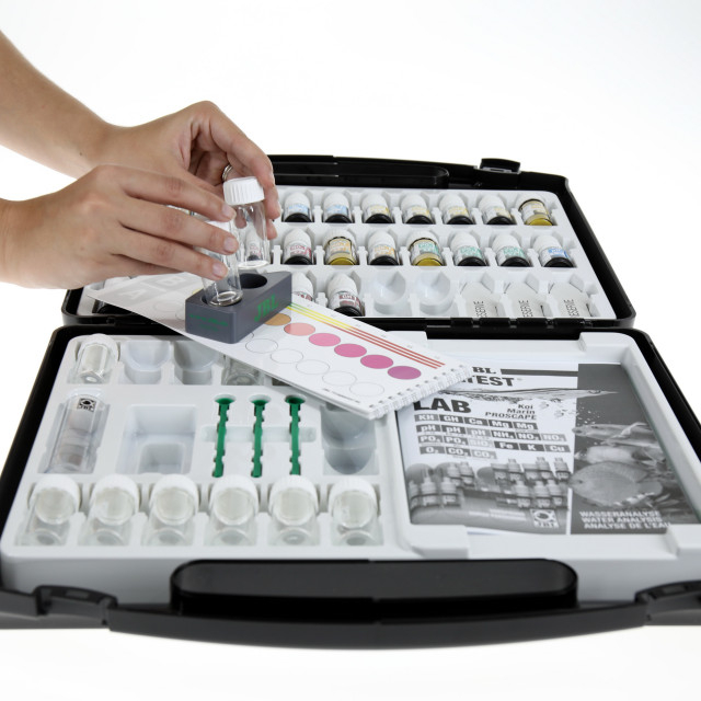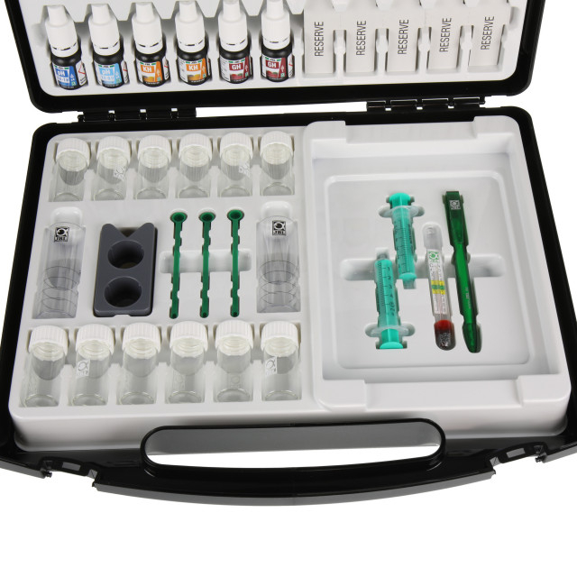 Continutul pachetului: 1 trusa de testare, incl. 13 reactivi, 12 flacoane de sticla, 2 seringi, 3 linguri de masurare, termometru, bloc de comparație, 2 cuvete din plastic, diagrame de culori, tabel CO2, stilou, foi de raport, instructiuni de operare